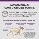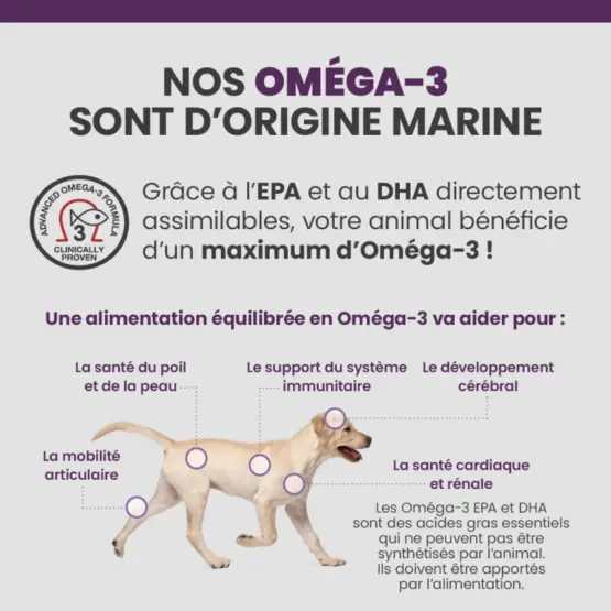 • Les acides gras Oméga-3 EPA et DHA (issus d’huile de poisson) ont un effet bénéfique sur la santé de la peau et du pelage, ainsi que sur les cartilages et la mobilité des articulations chez les chiens seniors.