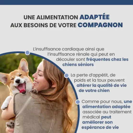 • Lors d’insuffisance cardiaque congestive, la mise en place de mécanismes compensateurs s’opposant à la diminution du débit cardiaque conduit à une rétention d’eau et de sodium. La teneur réduite en sodium de cet aliment contribue à briser le cercle vicieux de la rétention hydrique, ce qui est essentiel pour les chiens souffrant d’insuffisance rénale, hépatique et/ou ou cardiaque.