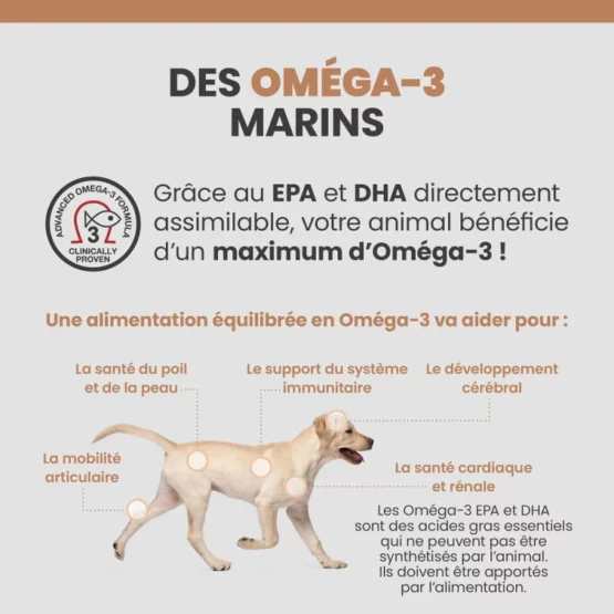 • Renforce la peau et le pelage par sa richesse en Oméga-6 GLA issus d’huile de bourrache.