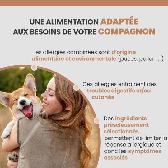 Aliment diététique complet spécialement formulé pour les chiens souffrant d’allergies multiples à la fois alimentaire et environnementale (pollen, acariens, puces,…)