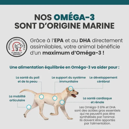• Les acides gras Oméga-3 (EPA et DHA issus d’huile de poisson) aident à maintenir une bonne mobilité articulaire chez les chiens en surpoids et ont également des effets bénéfiques sur la peau et le pelage.