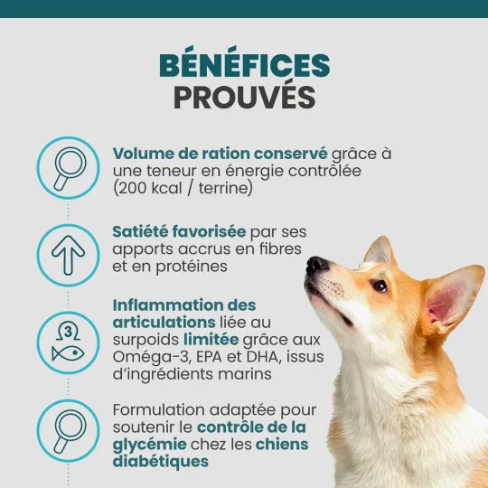 Aliment diététique complet pour la perte de poids et la régulation de la glycémie (en cas de diabète) chez le chien.