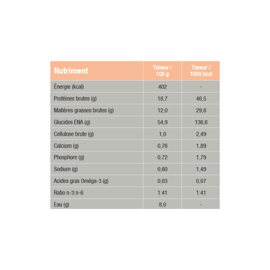 - Riz, protéines de riz, graisse de porc, protéines de saumon hydrolysées, cellulose en poudre, minéraux, vitamines et oligo-éléments.
