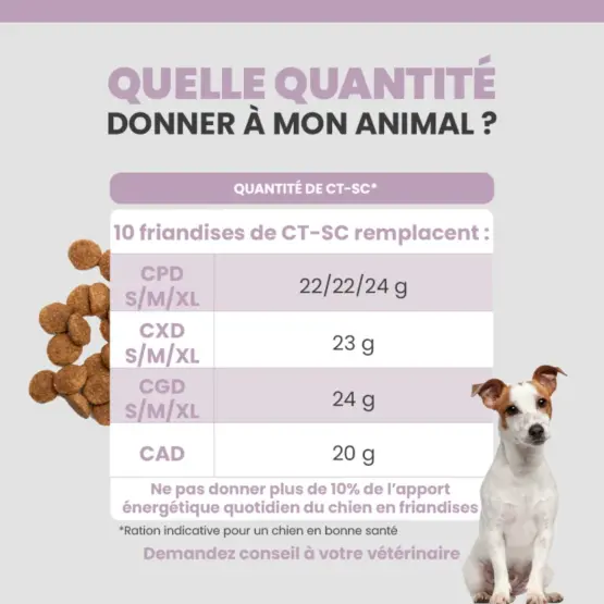 - Ne pas donner plus de 10 % de l'apport énergétique quotidien du chien. Afin d'éviter que le chien ne soit en surpoids, il est recommandé de réduire la ration alimentaire quotidienne en fonction de la quantitéde friandises distribuée.