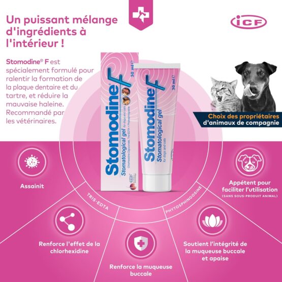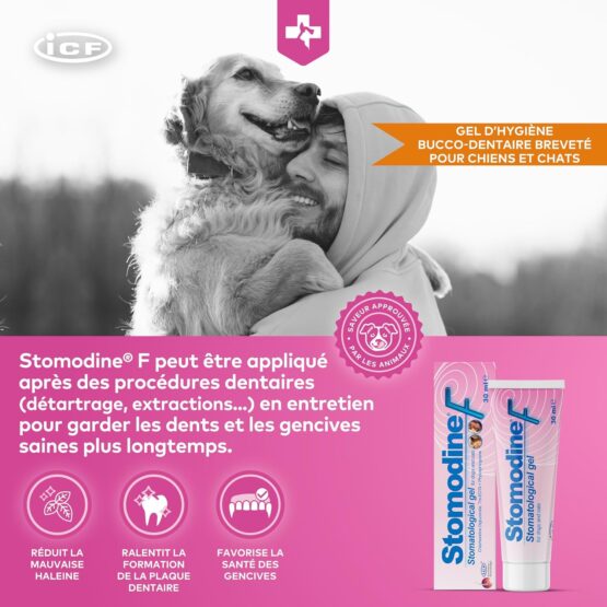 Stomodine est un gel buccodentaire appétent pour aider à lutter contre les bactéries responsables de l’accumulation de la plaque dentaire