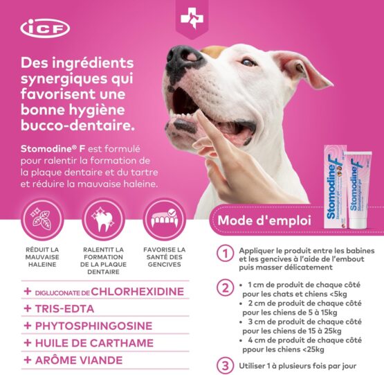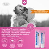 Stomodine® F contient un arôme artificiel de viande appétent qui facilite l’application par rapport à un brossage de dents classique.