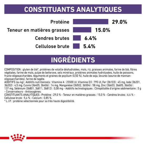 Riz, farine de maïs, protéines de volaille déshydratées, graisses animales, gluten de blé*, hydrolysat de protéines animales, pulpe de betterave, fibres végétales, huile de poisson, sels minéraux, levures, huile de soja, fructo-oligo-saccharides, extraits de thé vert (source de polyphénols), hydrolysat de crustacé (source de glucosamine), extrait de rose d?inde (source de lutéine), hydrolysat de cartilage (source de chondroïtine).ADDITIFS (au kg): Additifs nutritionnels : Vitamine A : 17400 UI, Vitamine D3 : 1100 UI, E1 (Fer) : 53 mg, E2 (Iode) : 5,3 mg, E4 (Cuivre) : 10 mg, E5 (Manganèse) : 69 mg, E6 (Zinc) : 208 mg, E8 (Sélénium) : 0,09 mg - Additifs technologiques : Triphosphate pentasodique : 3,5 g - Conservateurs - Antioxygènes. CONSTITUANTS ANALYTIQUES: Protéine : 22 % - Matières grasses brutes : 16 % - Cendres brutes : 5,2 % - Cellulose brute : 3,5 %.*L.I.P. : protéine sélectionnée pour sa très haute assimilation.