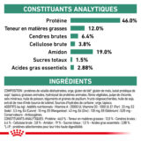 Viandes de volaille déshydratées, orge, gluten de blé*, gluten de maïs, tapioca, isolat protéique de soja*, graisses animales, hydrolysat de protéines animales, fibres végétales, pulpe de chicorée, huile de poisson, téguments et graines de psyllium, sels minéraux, Fructo-Oligosaccharides (FOS), huile de soja, extrait de rose d'Inde (source de lutéine). Additifs au kg : Vitamine A 6300 UI, Vitamine D3 1000 UI, E1 (Fer) 23 mg, E2 (Iode) 2,3 mg, E4 (Cuivre) 3 mg, E5 (Manganèse) 29 mg, E6 (Zinc) 88 mg, E8 (Sélénium) 0,02 mg. Conservateurs - Antioxygènes. *LIP (Low Ingestible Protein) protéine sélectionnée pour sa très haute digestibilité.