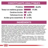 Riz, protéines de porc déshydratées, farine de maïs, maïs, graisses animales, gluten de maïs, fibres végétales, hydrolysat de protéines animales, sels minéraux, gluten de blé, pulpe de chicorée, huile de poisson, huile de soja, fructo-oligo-saccharides, tégument et graines de psyllium, extrait de rose d'Inde (source de lutéine).