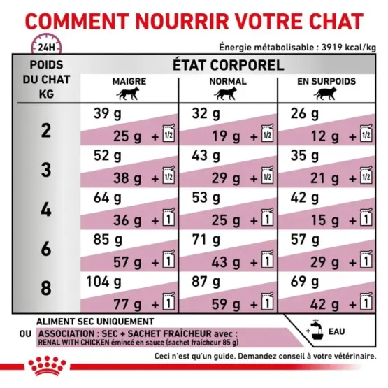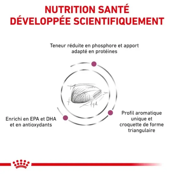 Royal Canin Cat Renal Special Chat est un aliment diététique complet formulé pour préserver la fonction rénale en cas d’insuffisance rénale ou de calculs rénaux.
