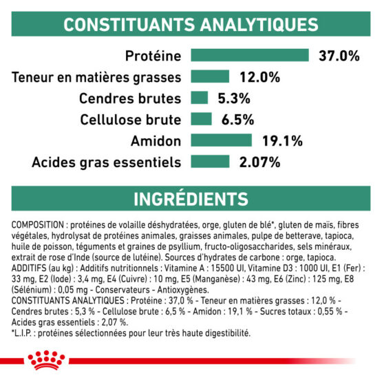 Protéines de volaille déshydratées, orge, gluten de blé, gluten de maïs, fibres végétales, graisses animales, tapioca, pulpe de betterave, hydrolysat de protéines animales, huile de poisson, téguments et graines de psyllium, Fructo-Oligo-Saccharides, minéraux, extrait de rose d'Inde (source de lutéine).
