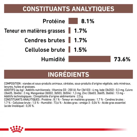 COMPOSITION : Viandes et sous-produits animaux, céréales, sous-produits d’origine végétale, substances minérales, huiles et graisses, levures. ADDITIFS (KG)** : Additifs nutritionnels : Vitamine D3 : 170 UI, Vitamine E : 140 mg, Vitamine C : 70 mg, Taurine : 0,4 g, Fer (3b103) : 4 mg, Iode (3b202) : 0,23 mg, Cuivre (3b405, 3b406) : 1,8 mg, Manganèse (3b502, 3b503, 3b504) : 1,2 mg, Zinc (3b603, 3b605, 3b606) : 12 mg - Additifs technologiques : Clinoptilolite d’origine sédimentaire : 2,5 g. ** Ces valeurs reflètent seulement les niveaux ajoutés à la formule, et non ceux naturellement présents dans les composants de l’alimentation.