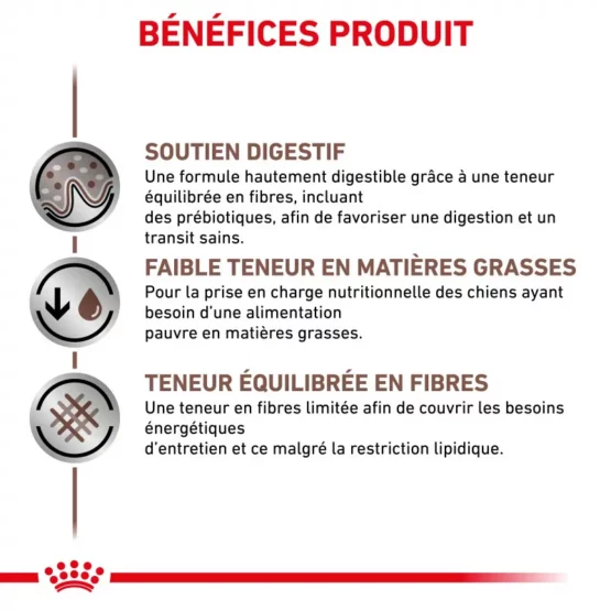 Royal Canin Dog Gastro Intestinal est un aliment réduit en matière grasse et faible teneur en fibres.