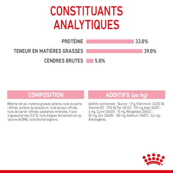 Additifs nutritionnels : Taurine : 1,9 g, Vitamine A : 26300 Ul, Vitamine D3 : 1700 Ul, Fer (3b103) : 100 mg, lode (3b201) : 4 mg, Cuivre (3b405) : 15 mg, Manganese (3b503) : 80 mg, Zinc (3b605) :