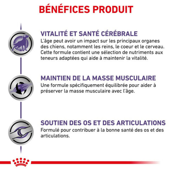 - Une formule équilibrée en protéine et en minéraux, et suplémentée en acides gras essentiels pour protéger et nourrir les os et les articulations des chiens âges.