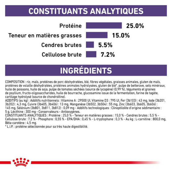 Riz, maïs, protéines de porc déshydratées, blé, fibres végétales, graisses animales, gluten de maïs, hydrolysat de protéines animales, gluten de blé, protéines de volaille déshydratées, sels minéraux, pulpe de betterave, huile de poisson, tomate (source de lycopène), huile de soja, fructo-oligo-saccharides, téguments et graines de psyllium, hydrolysat de crustacé (source de glucosamine), huile de bourrache, extraits de thé vert et de raisins (sources de polyphénols), hydrolysat de cartilage (source de chondroïtine), extrait de rose d'inde (source de lutéine). ADDITIFS (au kg): Additifs nutritionnels : Vitamine A : 24900 UI, Vitamine D3 : 800 UI, E1 (Fer) : 41 mg, E2 (Iode) : 2,8 mg, E4 (Cuivre) : 11 mg, E5 (Manganèse) : 54 mg, E6 (Zinc) : 203 mg, E8 (Sélénium) : 0,1 mg - Additifs technologiques : Triphosphate pentasodique : 3 g, Lécithine : 750 mg - Conservateurs - Antioxygènes. CONSTITUANTS ANALYTIQUES: Protéine : 25 % - Matières grasses brutes : 15 % - Cendres brutes : 5,5 % - Cellulose brute : 7,3 %).