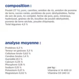 Viandes et sous-produits animaux (poulet 9 %), céréales, sous-produits d'origine végétale, légumes (4 %), huiles et graisses, extraits de protéines végétales, matières minérales, graines.
