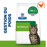 Hill’s Prescription Diet Feline Metabolic est un aliment complet et équilibré, cliniquement prouvé pour favoriser la perte et le maintien du poids chez le chat.