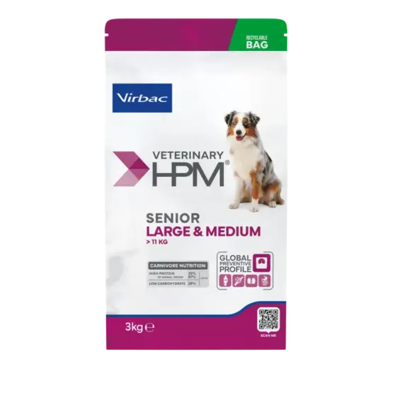 Senior Dog Large & Medium est une alimentation complète et équilibrée adaptée aux besoins du chien sénior que la baisse d’activité prédispose à la fonte musculaire et à l’ankylose des articulations.