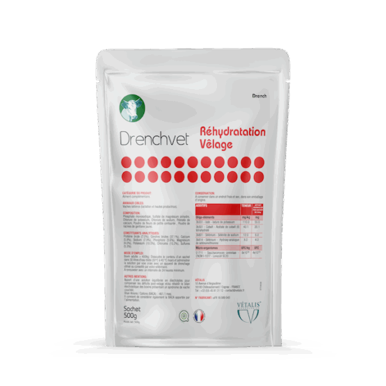 Apport d’une solution équilibrée en électrolytes pour compenser les déficits post-vêlage et/ou rétablir le bilan électrolytique des bovins présentant un syndrome de vache couchée.