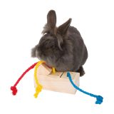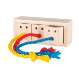 En tirant sur les cordes en sisal, l’animal obtient les friandises contenues dans les cubes individuels.
