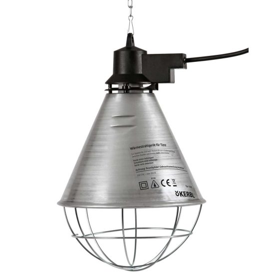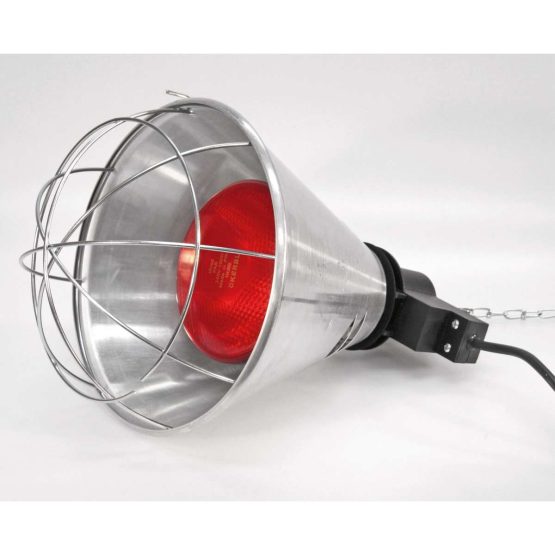 L’écran en aluminium a un diamètre de 21 cm et est équipé de 6 fentes d’aération pour assurer une meilleure circulation de l’air. L’ampoule infrarouge est protégée par une grille et une chaîne de montage est incluse.