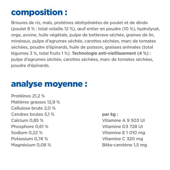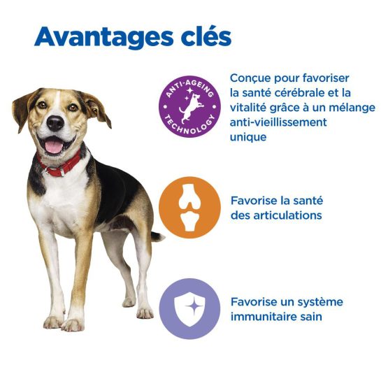 Aliment complet aux multi-bénéfices conçu pour soutenir le cerveau et le corps des chiens vieillissants (plus de 7 ans) de moyenne et grande race.