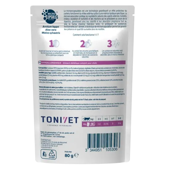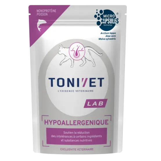 Alimentation humide en sachets fraîcheurs pour chat adulte qui vise à réduire les intolérances à certains ingrédients.