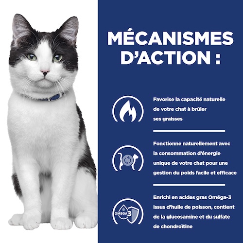 Aliment diététique complet destiné à la réduction de l’excès pondéral et au soutien du métabolisme articulaire en cas d’ostéoarthrose chez les chats adultes.