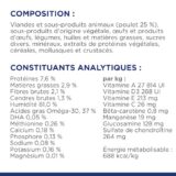COMPOSITION: Viandes et sous-produits animaux (poulet 14%), extraits de protéines végétales, céréales, sous-produits d’origine végétale, huiles et graisses (huile de poisson 2,8%), légumes, graines, minéraux, mollusques et crustacés. Source de glucides: Brisures de riz. CONSTITUANTS ANALYTIQUES: Protéines 38,0%, Teneur en matières grasses 13,7%, Cellulose brute 10,0%, Cendres brutes 6,3%, Acides gras Oméga-3 1,9%, DHA 0,29%, Amidon 16,6%, Sucres totaux 0,39%, Méthionine 1,2%, Calcium 0,87%, Phosphore 0,68%, Sodium 0,37%, Potassium 0,91%, Magnésium 0,08%; par kg: Vitamine A 9 568UI, Vitamine D3 692UI, Vitamine E 1 181mg, Vitamine C 135mg, Bêta-carotène 2,7mg, Manganèse 100mg, Glucosamine 1 299mg, Sulfate de chondroïtine 1 106mg. Énergie métabolisable: 3 461 kcal/kg. ADDITIFS PAR KG: Additifs nutritionnels: 3b103 (Fer) 65,8mg, 3b202 (Iode) 1,6mg, 3b405 (Cuivre) 6,5mg, 3b502 (Manganèse) 84,1mg, 3b603 (Zinc) 115mg, 3b801 (Sélénium) 0,1mg, avec un antioxydant naturel.