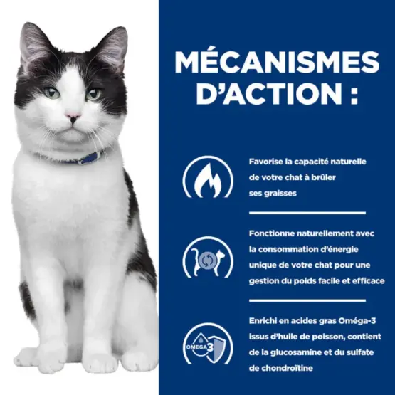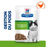 Hill’s PRESCRIPTION DIET Metabolic + Mobility Sachet repas pour Chat au Poulet est un aliment diététique complet destiné à la réduction de l’excès pondéral et au soutien du métabolisme articulaire en cas d’ostéoarthrose chez les chats adultes.