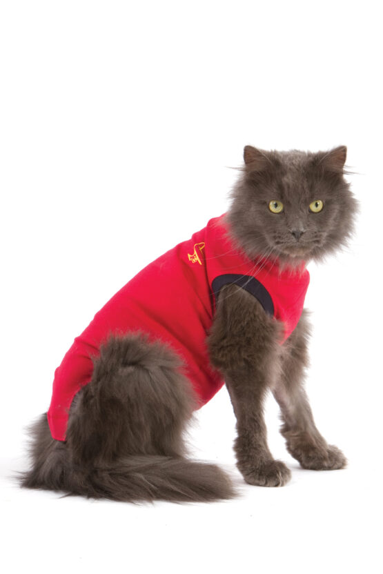 – Après une intervention chirurgicale, remplace la collerette. Ne serre pas le ventre et maintient l’animal au chaud. Coloration ventrale bleu clair permettant le contrôle d’éventuels suintements de la plaie. Ajout possible d’une compresse dans la doublure ventrale.