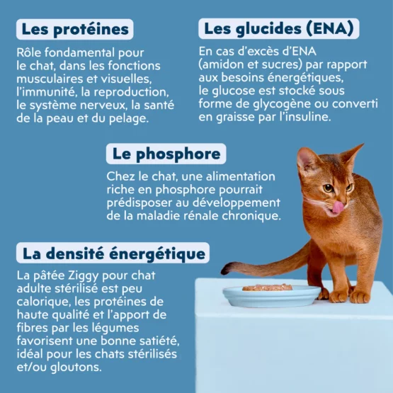 La pâtée est en moyenne 4x moins calorique que les croquettes, riche en eau et en protéines de qualité, elle apporte du volume et peu de calories, et donc une meilleure satiété qui aide à réduire les risques d’obésité et de surpoids et tout en préservant la masse musculaire.