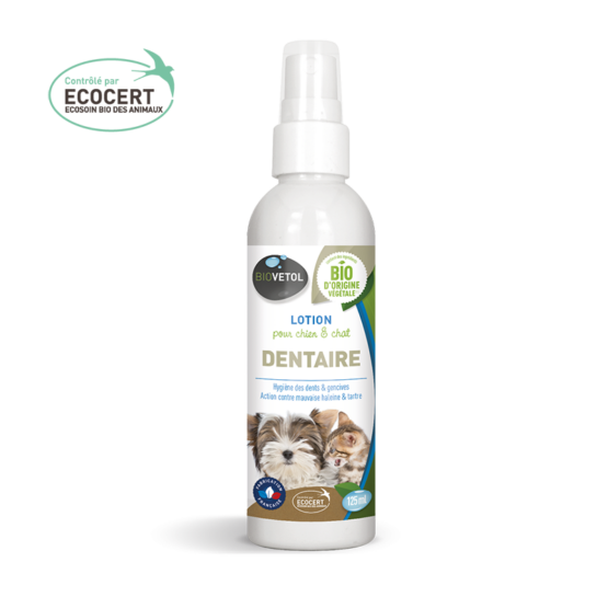 Lotion dentaire pour chien et chat, qui contribue à la bonne hygiène buccale de votre animal.