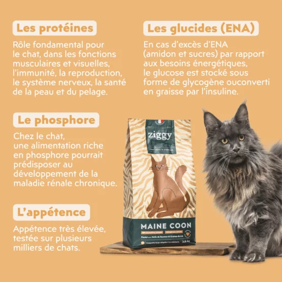 NOUVEAUTÉ ! Les délicieuses croquettes Ziggy pour Maine Coons et grands chats qui répondent parfaitement à leurs besoins nutritionnels et qui sont adaptées spécifiquement à la morphologie de ces félins à la mâchoire large et puissante.