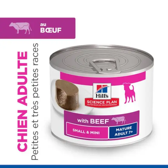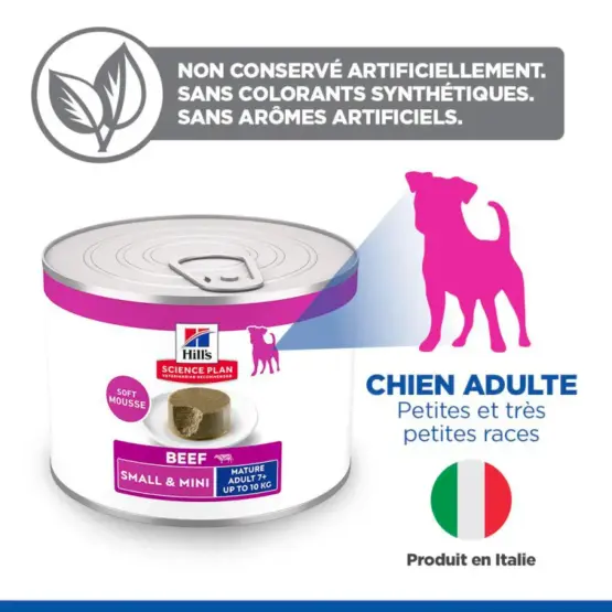 Hill’s Science Plan Small & Mini – Mousse pour Chien Mature – Petites et Très Petites Races au Bœuf est un aliment complet pour les chiens adultes matures de petite taille âgés de 7 ans et plus.
