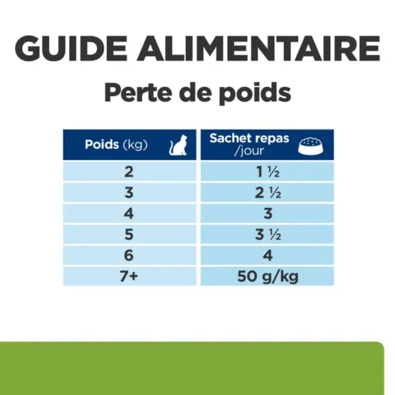 POUR LA PERTE DE POIDS : Déterminez la quantité d’aliment sur la base du poids cible plutôt que du poids actuel. Pour un chat de 4 kg, donnez 3 sachets par jour.