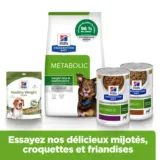 Prescription Diet™ Metabolic Canine Mijoté est un aliment diététique complet destiné à la réduction de l’excès de poids corporel et au maintien du poids de forme chez le chien adulte. Cet aliment diététique pour animaux de compagnie présente une faible densité énergétique.