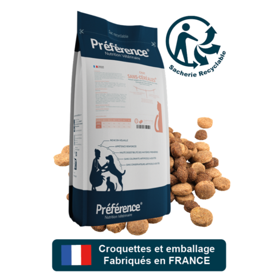 Volaille déshydratée (34%), pulpe de pomme de terre déshydratée, pois déshydratés, crevettes déshydratées (4%), graisse de volaille, hydrolysat de protéines animales, graine de lin (1,7%), pulpe de betterave déshydratée, pulpe de chicorée déshydratée (1,5%), fibres végétales déshydratées (1%), huile de poissons, levures (0,1%), yucca schidigera déshydraté (0,1%).