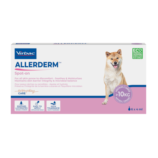Les pipettes spot-on Allerderm apaisent et hydratent la peau des chiens tout en préservant l’intégrité de la barrière cutanée et l’équilibre microbien.