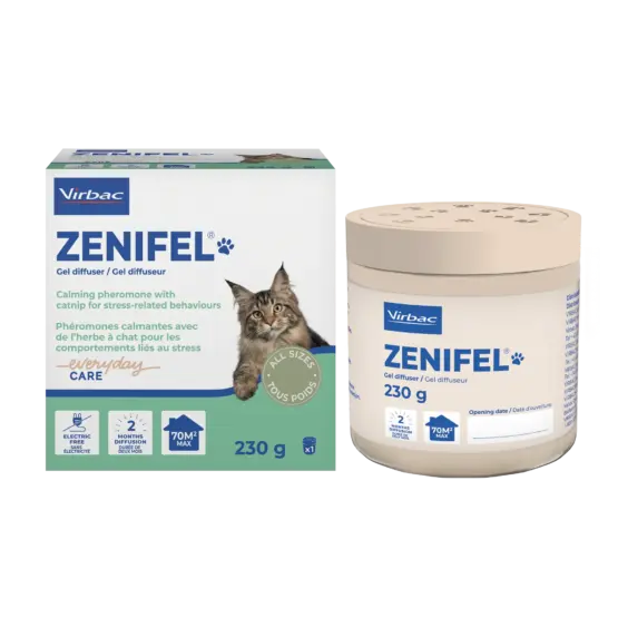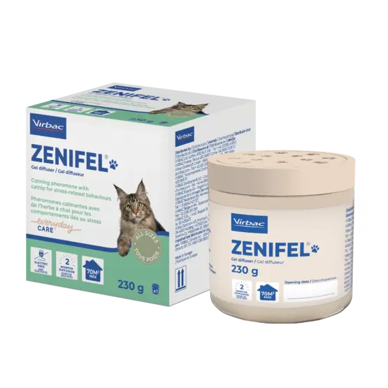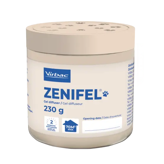 Zenifel® Gel diffuseur est un diffuseur de phéromones apaisantes pour chats qui fonctionne sans électricité.