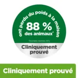 - Perte de poids sans privation – 81% des chats ont perdu du poids en 2 mois à domicile, 89% des chats ont terminé le programme de perte de poids