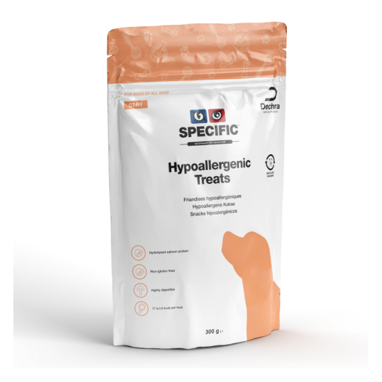 Savoureuses friandises hypoallergéniques pour chiens, contenant des protéines de saumon hydrolysées et du riz, sources de protéines et de glucides connues pour leur faible allergénicité et leur haute digestibilité.