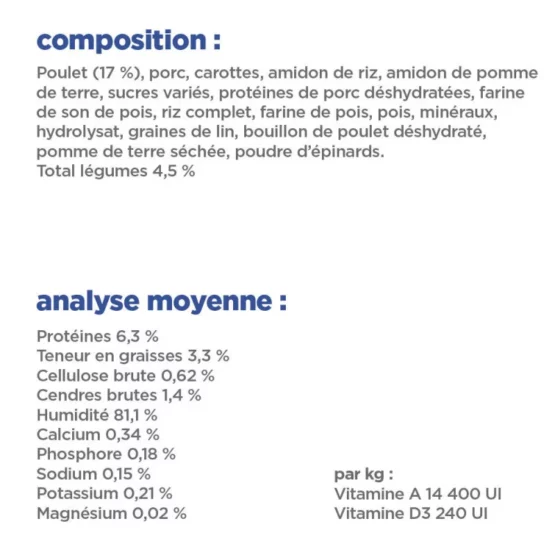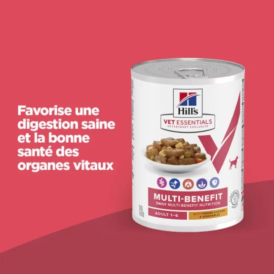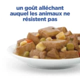 Alimentation en boîte pour chien adulte délicieusement mijotée avec de vrais morceaux de poulet et de petits légumes.
