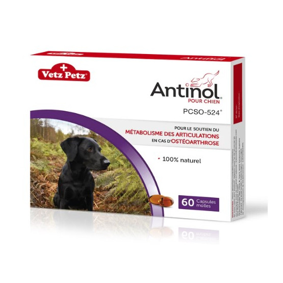 Antinol®️ contribue à la santé des articulations et favorise le confort et la mobilité au quotidien de votre chien. Il est formulé pour le soutien du métabolisme des articulations en cas d’ostéoarthrose. Antinol pour chien contient un concentré de lipides marins unique, durable et exclusif – soutenu par une science mondiale, il est naturel et sûr pour une utilisation à long terme.