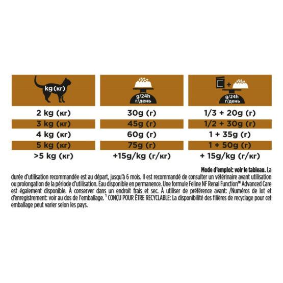 La durée d'utilisation recommandée est initialement jusqu'à 6 mois. Avant utilisation ou avant prolongement de la durée d'utilisation, il est recommandé de demander l'avis d'un vétérinaire. De l'eau propre et fraîche doit être en permanence à disposition. Existe également en boîte et en sachet fraîcheur. 30g de croquettes Feline NF peuvent être remplacés par un sachet fraîcheur Feline NF. 35g de croquettes Feline NF peuvent être remplacés par ½ boîte Feline NF.