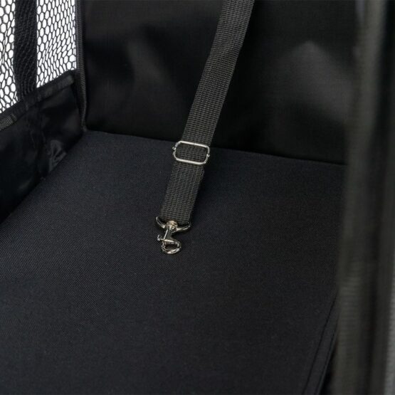 Le sac est fermé par des fermetures à glissière et peut être ouvert par le haut et par le côté (le côté court du sac s’ouvre). Une étagère fixe assure la stabilité. Il peut être fixé à l’aide de boutons-pression afin d’éviter qu’il ne glisse. Lorsqu’il n’est pas utilisé, le fond peut être retiré pour essuyer facilement l’enveloppe en plastique. Une poche latérale pratique offre de la place, par exemple pour le carnet de vaccination, les médicaments ou les friandises.