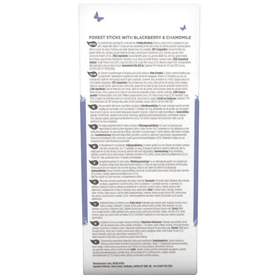 Foin de fléole des prés moulu, farine de foin de luzerne, farine d'avoine, farine de caroube séchée, farine de pois, mûres (4%), graines de lin, huile de soja, fleurs de camomille séchées (0,5%).