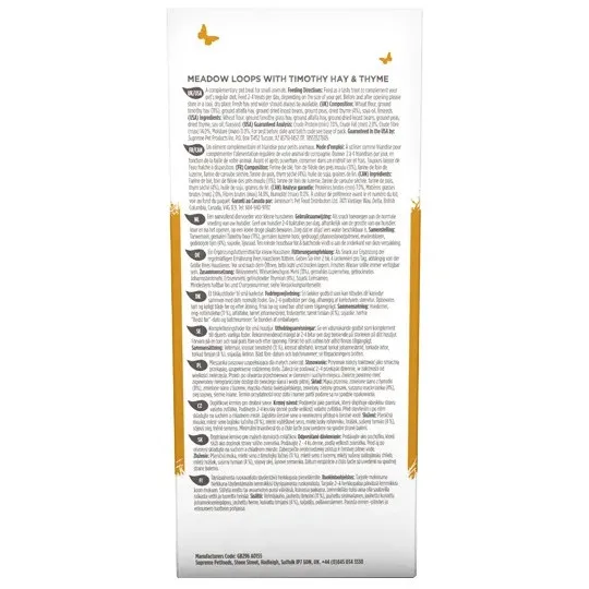 Farine de blé, foin de fléole des prés moulu, farine de foin de luzerne, farine de caroube séchée, farine de pois, huile de soja, graines de lin, pissenlit séché (1%, équivalent à 7% pissenlit), églantier séché (1%, équivalent à 7% églantier.)