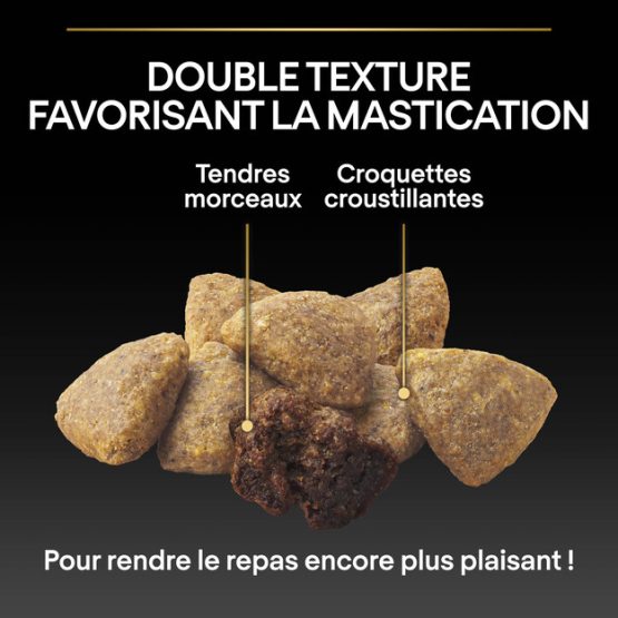 Une combinaison unique de petites croquettes croustillantes et de tendres petits morceaux effilés pour une alimentation complète chez le chien de petite taille.